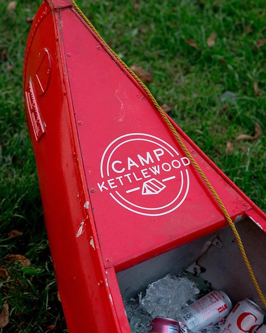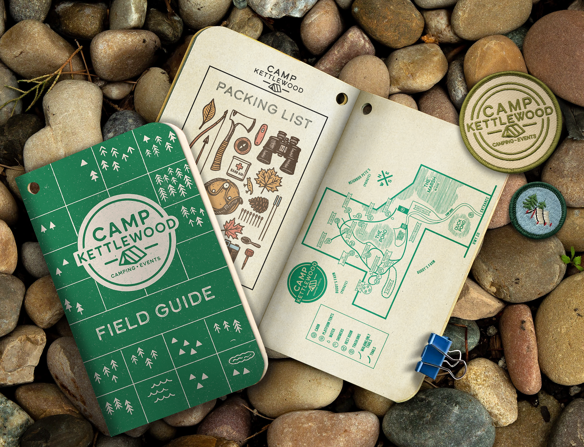 ▼ CAMP LOGO Once a Girl Scout camp, Camp Kettlewood carries a rich history that inspired the logo design. The logo draws from the original vintage Girl Scout camping merit badge, blending nostalgia with a fresh, modern feel.