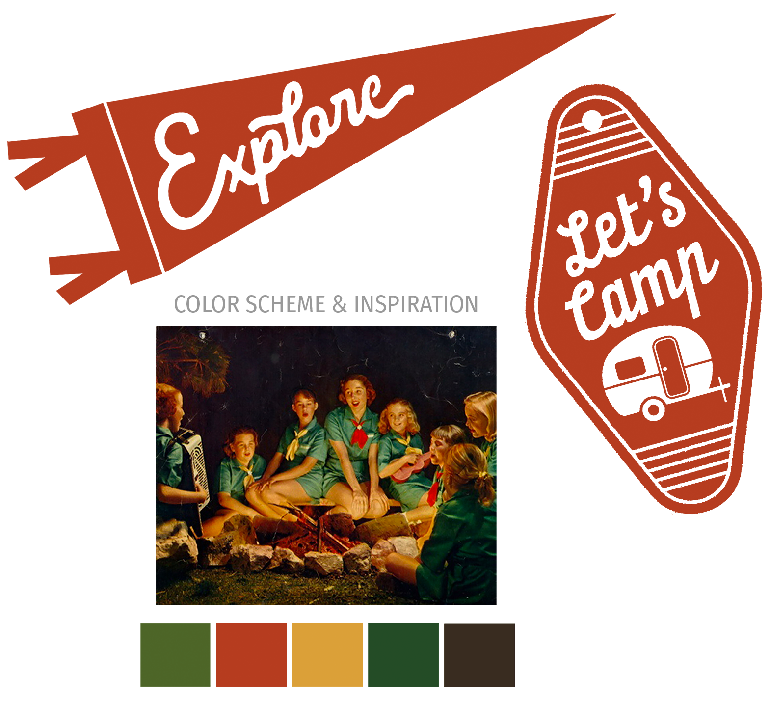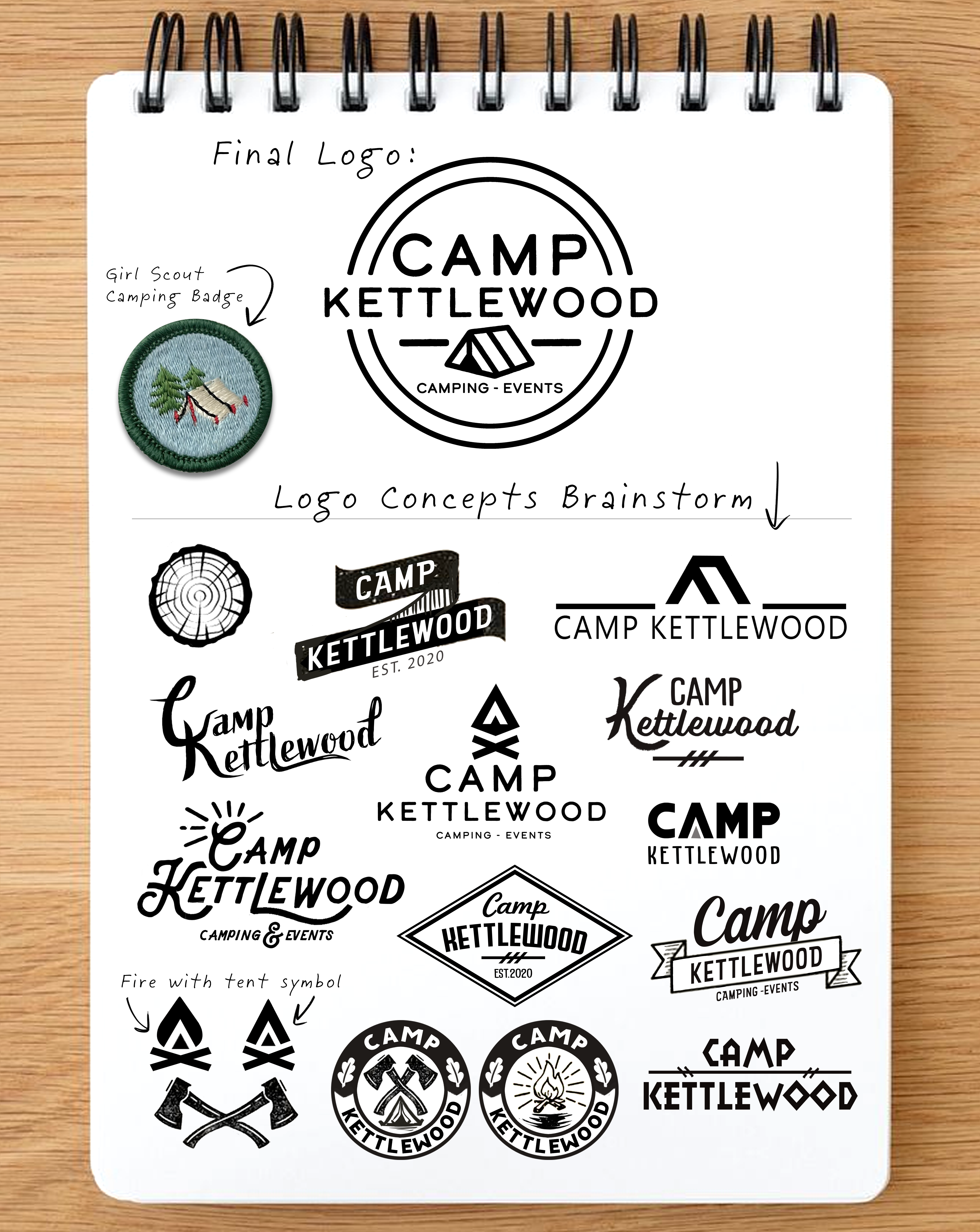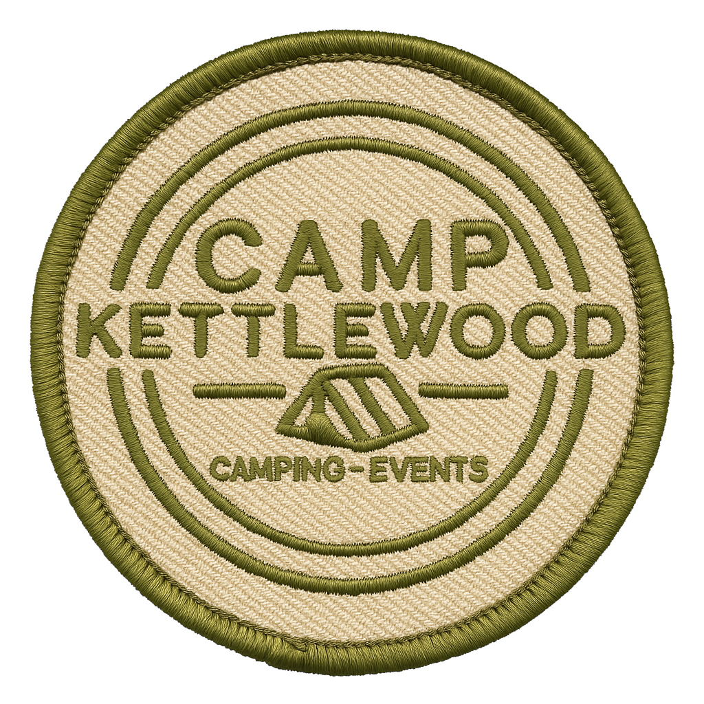 ▼ CAMP LOGO Once a Girl Scout camp, Camp Kettlewood carries a rich history that inspired the logo design. The logo draws from the original vintage Girl Scout camping merit badge, blending nostalgia with a fresh, modern feel.