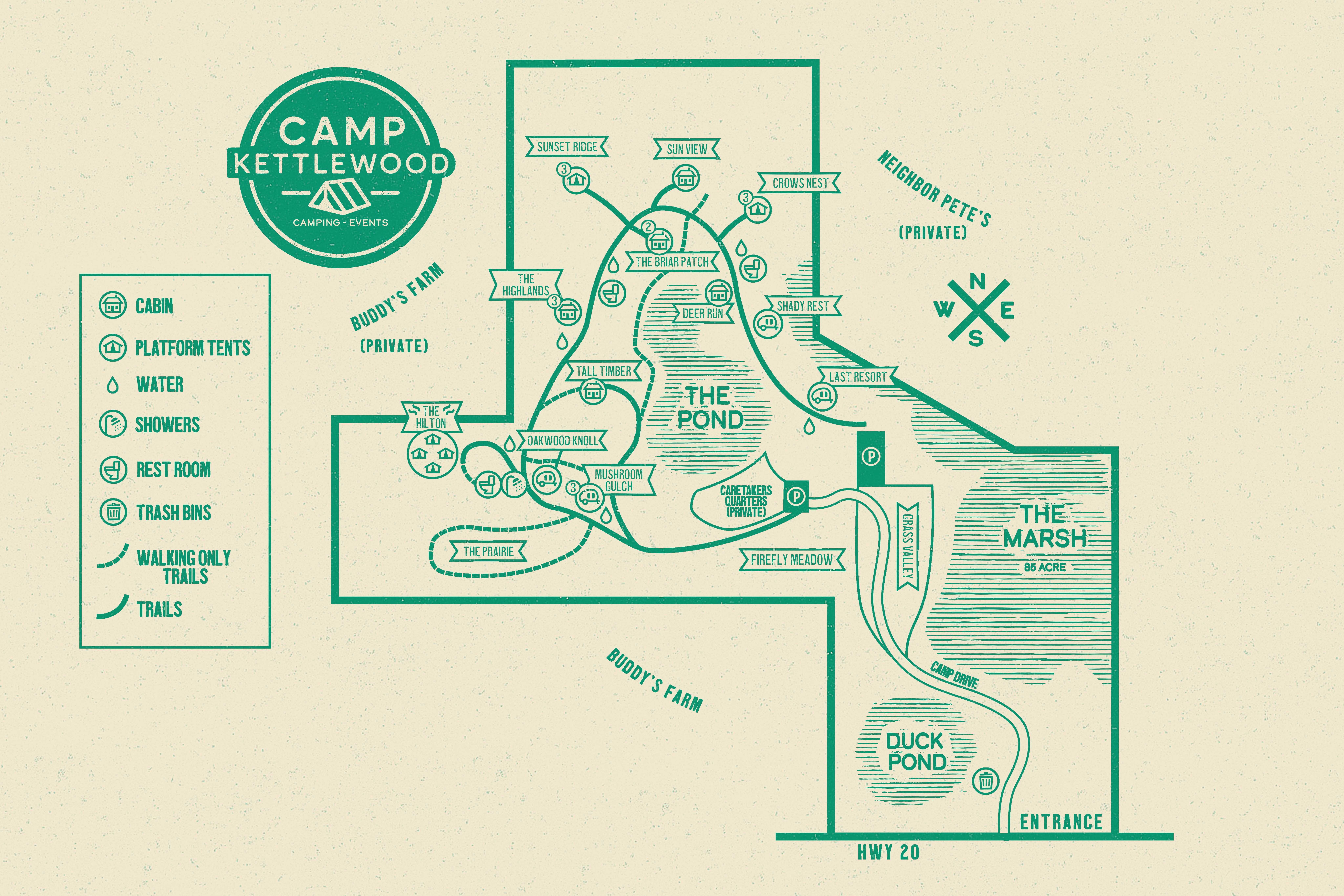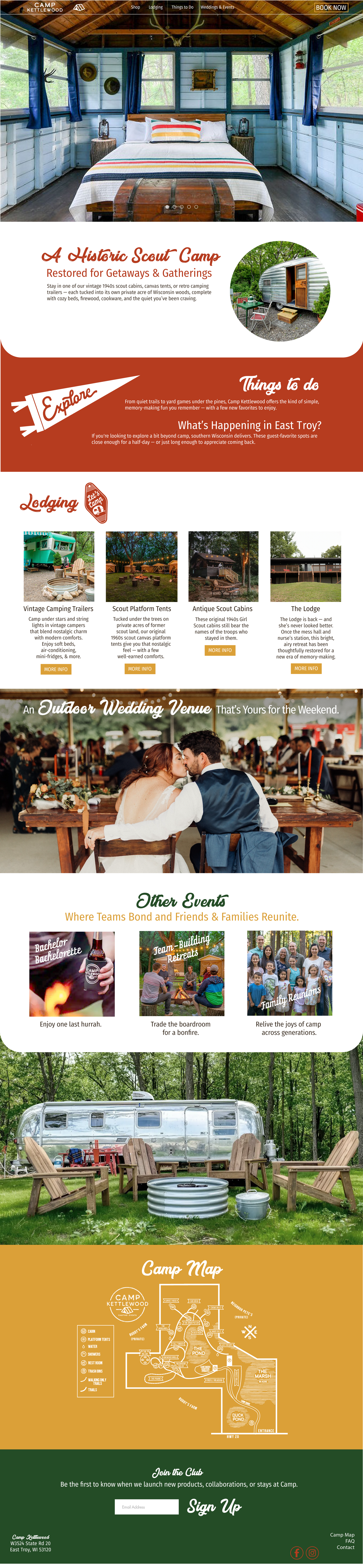 ▼ WEBSITE I designed this website for Camp Kettlewood with the goal of reflecting the camp’s unique character. The layout and visual elements were crafted to capture the nostalgic, vintage feel of the campground while maintaining a clean and user-friendly design. The result is a site that balances charm and functionality, evoking the atmosphere of the camp while providing visitors with clear, accessible information.