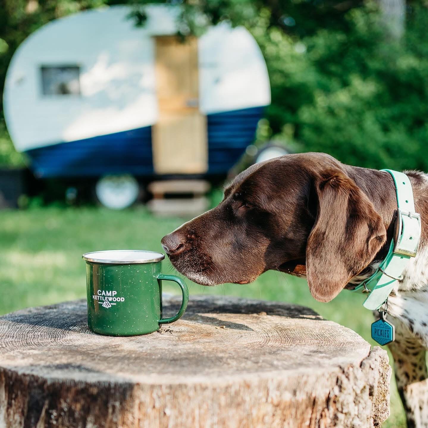 Photo from camp ground, mug with logo, and Pickles the dog.