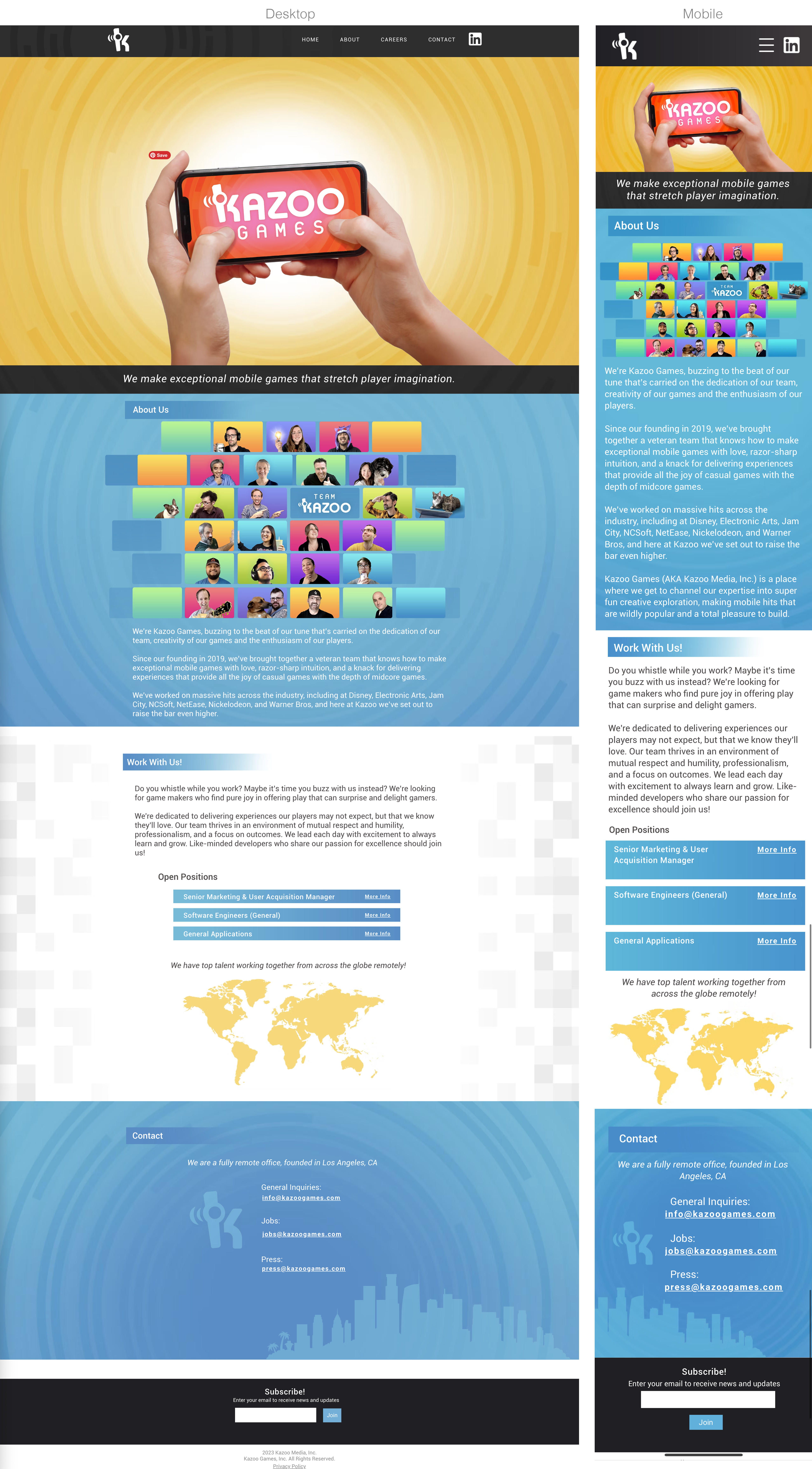 ▼ WEB DESIGN MOCK-UP I designed the Kazoo Games website at an early stage, before the studio had any published titles. My goal was to establish a strong brand presence that captured the company’s playful and approachable identity. Through a light, bright color palette, clean layouts, and cheerful visual elements, I built a site that conveys energy and creativity while laying the foundation for future growth. All imagery featured on the site was created by me.