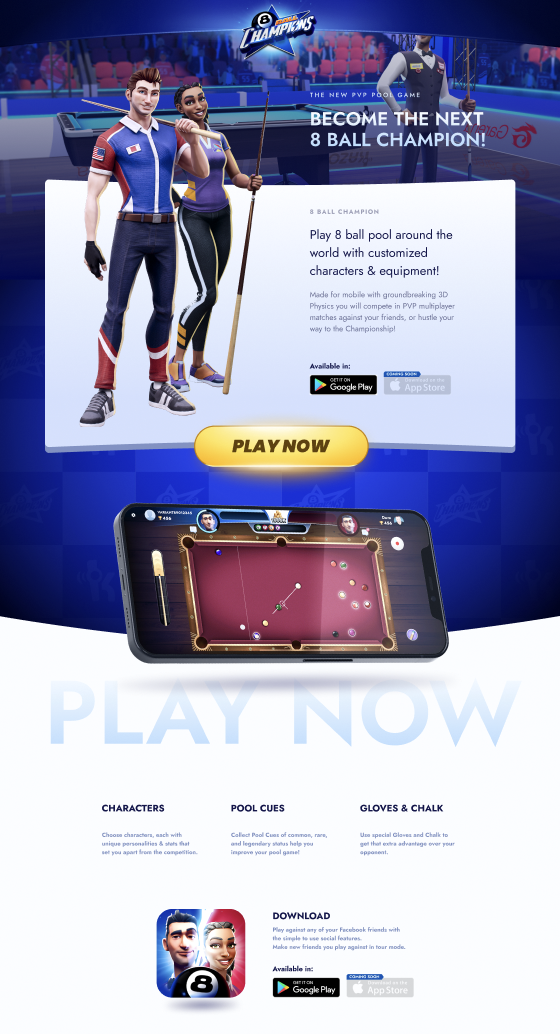▼ 8 BALL CHAMPIONS MARKETING ART & WEB PROMO PAGE DESIGN 8 Ball Champions is a PvP billiards game developed by Kazoo Games. For the page shown below, I was responsible for the text and image layout, as well as the overall composition and supporting visual elements. (plus responsible for app icon design)
